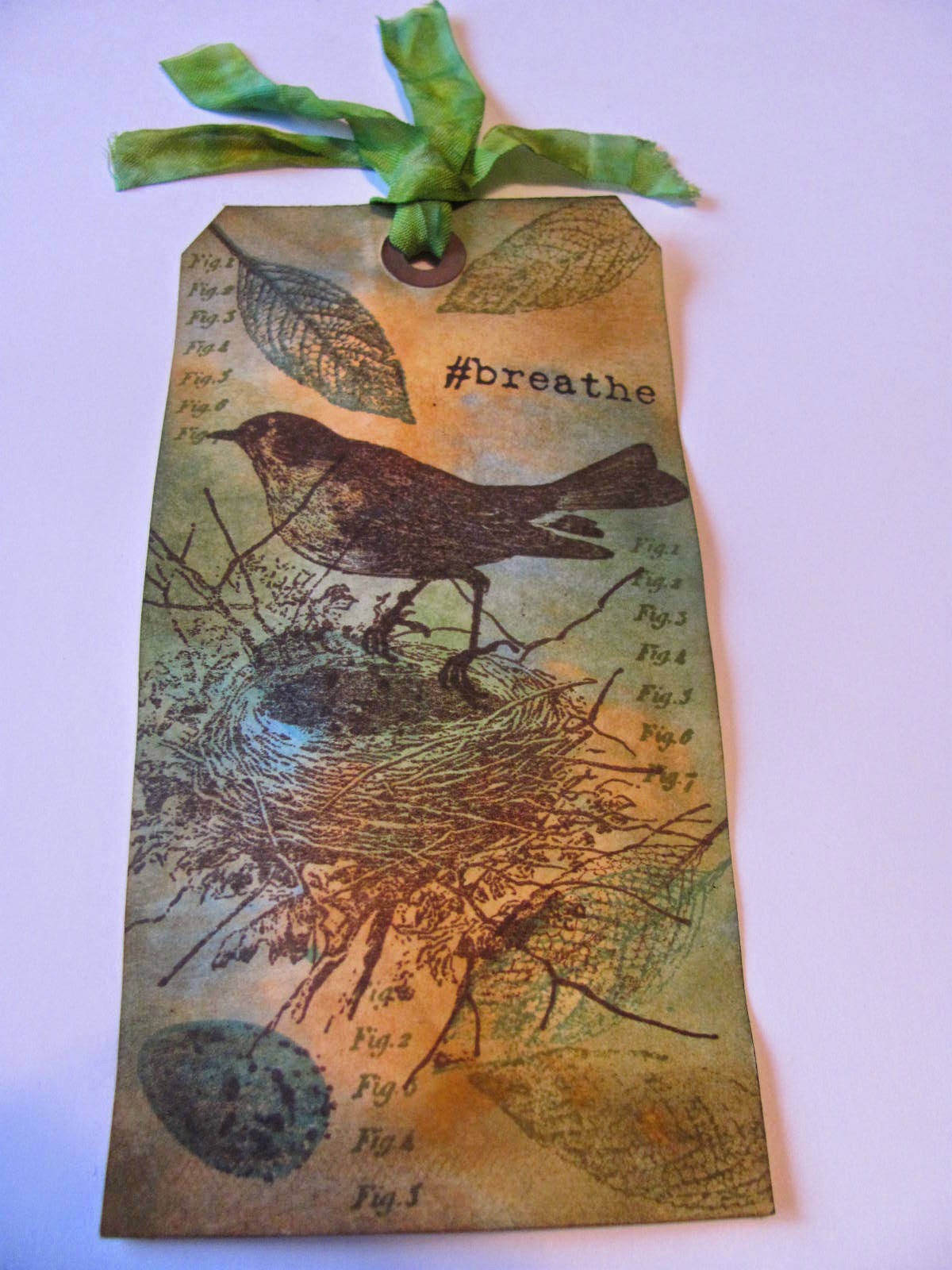 Once again the wonderful and talented Linda Ledbetter has challenged us to work our way through the king of art himself, Tim Holtz's third book. The first challenge is found on page 43, Paint Marbling. Sorry, I can't tell you how to do the technique, you have to buy your own copy of the book to play along. If you order it from Tim's blog, he will sign it for you! Sweeeeeet! This challenge is sponsored by Inspiration Emporium. You can buy all the latest and greatest art supplies there. Go have a look. To join in the challenge, go to Linda's blog here. i have been feeding and watching my feathered friends return from the horrible long Wisconsin winter we endured this year. I kept my tag very simple so as not to cover up the technique too much and had to use the bird and nest on it. I used a fw of Wendy's Archival colors also along with my distress.